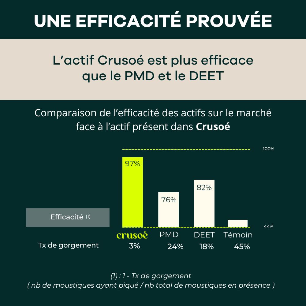 "The in-depth study of the olfactory mechanism of mosquitoes has allowed us to develop an innovative scientific approach. Crusoe was born from a biomimetic process that allows us to generate a natural molecule with strong repellent properties. Comparison tests carried out on our active ingredient demonstrate a much higher efficiency than synthetic chemical molecules.